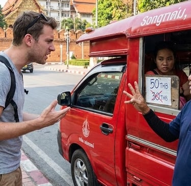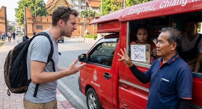 The Scenario: You flag down a red truck. You ask the driver, "How much to go to Nimman?" The driver looks at you, sees you are a tourist, and says "100 Baht."