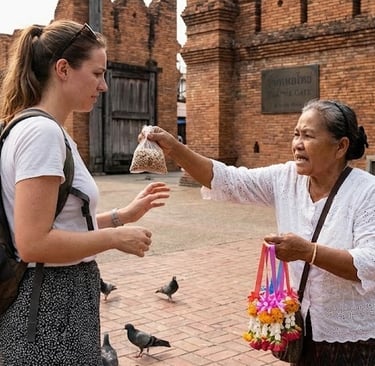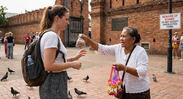 The Scenario: You are at Tha Phae Gate taking photos of the pigeons or the ancient wall. Suddenly, someone shoves a bag of bird feed or a flower garland into your hands. You instinctively grab it.