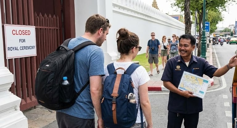 The Scenario: You are walking toward the entrance of a famous temple. A polite, well-dressed stranger approaches you. They speak excellent English. They inform you that, unfortunately, the temple is closed today due to a "Special Buddhist Holiday," "Monk Cleaning Day," or a "Royal Ceremony."