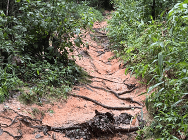 Terrain: Well-worn dirt path, tree roots, and some rocks.