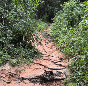 Terrain: Loose gravel, steep dirt inclines, and dense undergrowth.