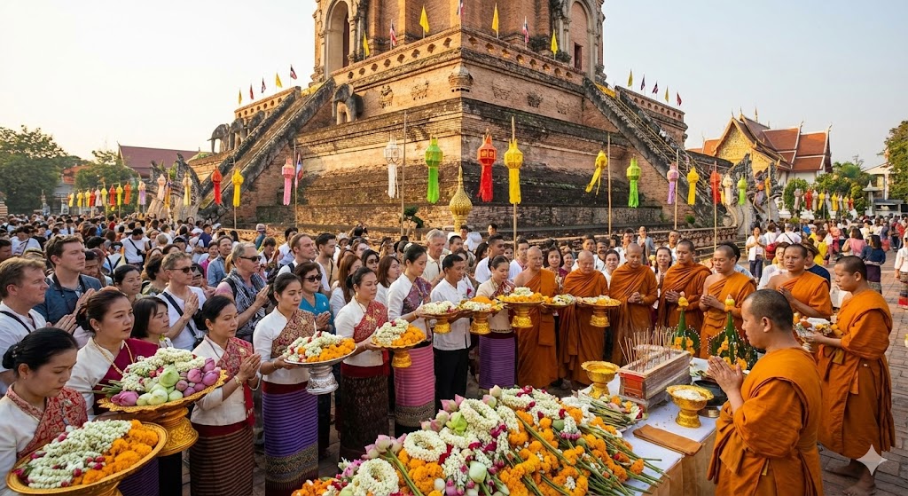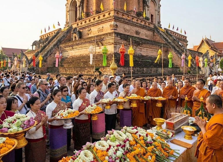The Experience: This is a festival of flowers, incense, and deep devotion. You will see thousands of Chiang Mai residents dressed in traditional Lanna clothing (often white or indigo) walking slowly around the shrine. They carry small bowls filled with colorful flowers, candles, and incense, placing them in designated offering bowls.