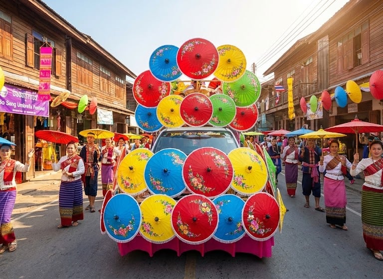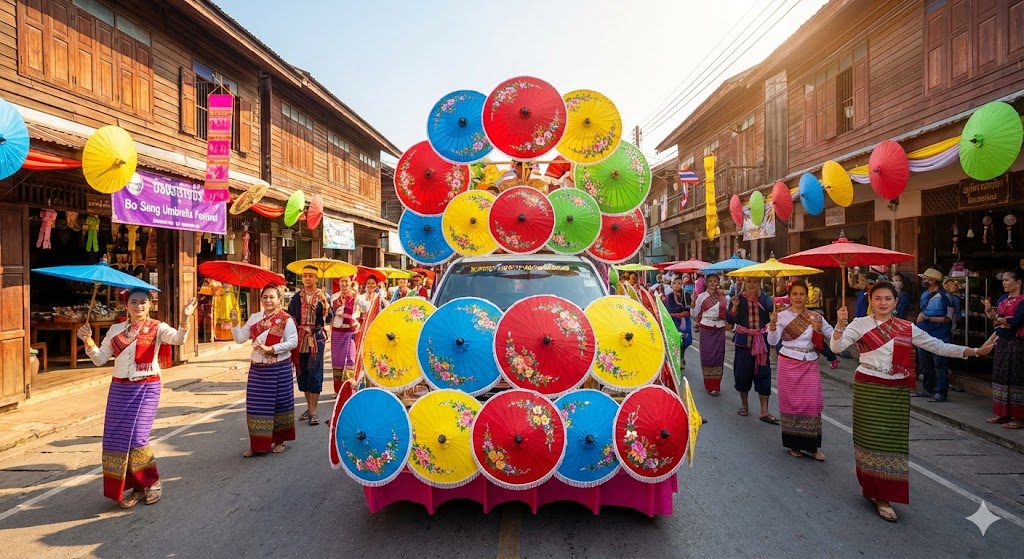 If you love art, color, and handicrafts, this is the festival for you. Bo Sang is globally recognized as the "Umbrella Village," where artisans have been making hand-painted, bamboo-and-mulberry-paper umbrellas for generations.