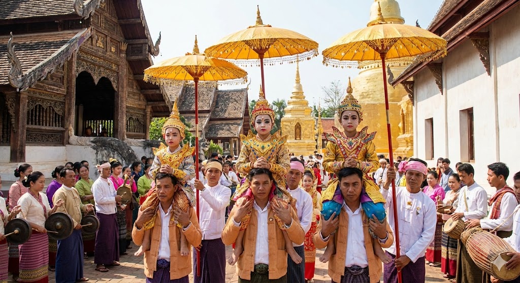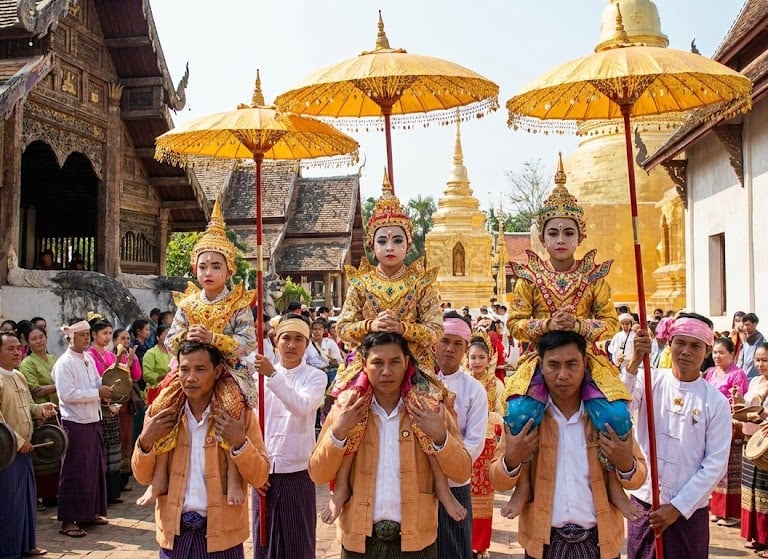 Because they are considered "royalty" during this time, their feet are not allowed to touch the ground. They are carried everywhere on the shoulders of their male relatives, protected by gold umbrellas. The parades are loud, featuring gongs, drums, and dancing, as the community celebrates the immense merit the boys are bringing to their families.