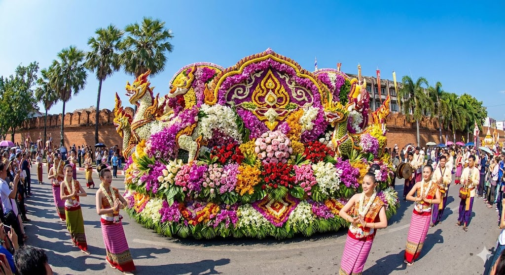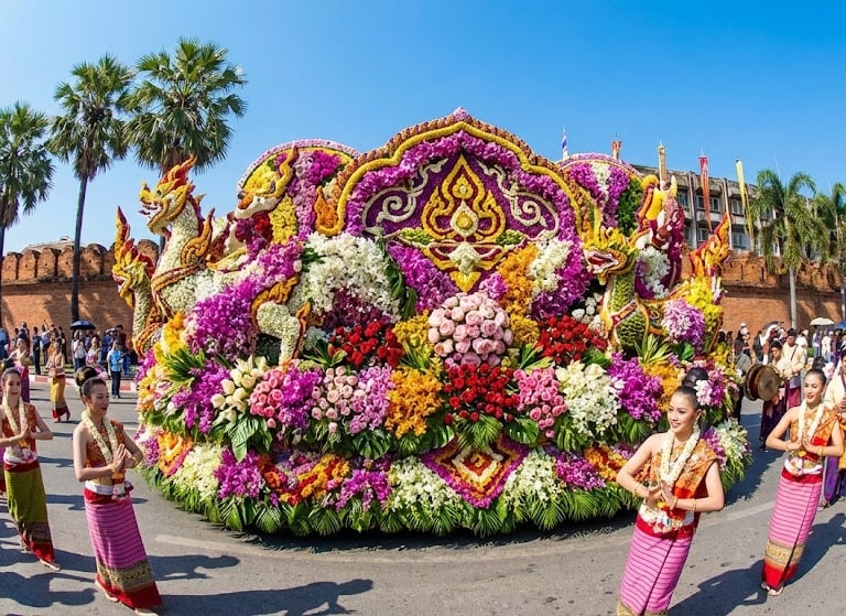 The Experience: The main event is the Saturday morning parade, starting from Nawarat Bridge and ending at Suan Buak Haad Park. The floats are massive, intricately designed sculptures made entirely of fresh flowers—orchids, chrysanthemums, roses, and marigolds. They are accompanied by marching bands, hill tribe groups in traditional dress, and the candidates for the Miss Chiang Mai Flower Festival beauty pageant.