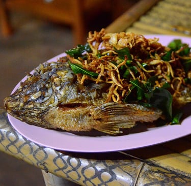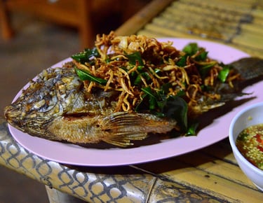 Samun Phrai Fried Fish: Deep-fried fish buried under a mountain of crispy local herbs.