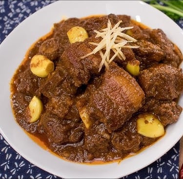 Gaeng Hang Lay (แกงฮังเล): The iconic Northern pork belly curry. At Han Teung, it is dark, rich, and deeply flavorful with ginger and tamarind. The meat falls off the bone if you even look at it.