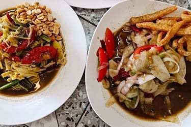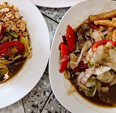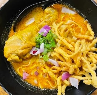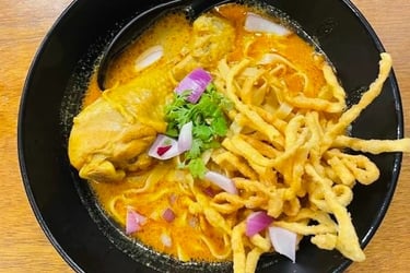This is the undisputed King of Northern Thai cuisine. If you only eat one dish, make it this. It’s a rich, creamy, coconut-based curry soup, often with a tender chicken drumstick or beef, served with soft egg noodles in the broth and a crown of crispy-fried egg noodles on top. It's served with a side of pickled mustard greens, shallots, and lime. The combination of creamy, spicy, savory, and crunchy is pure magic.