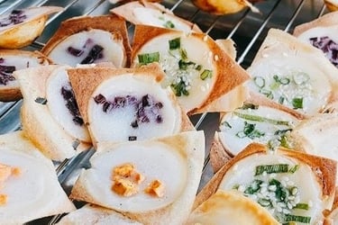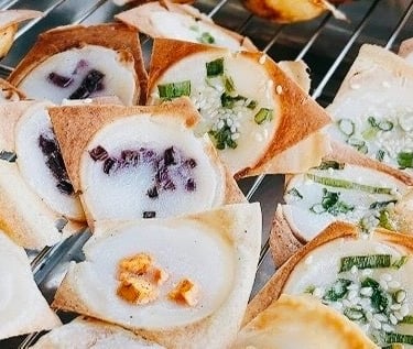 Time for dessert. These are tiny, sweet and savory coconut-rice pancakes. A batter of rice flour, coconut milk, and sugar is poured into a special cast-iron pan, and as it cooks, it becomes crispy on the outside and impossibly soft and custardy on the inside. They are often served as little half-moons, sometimes topped with a bit of green onion or corn.