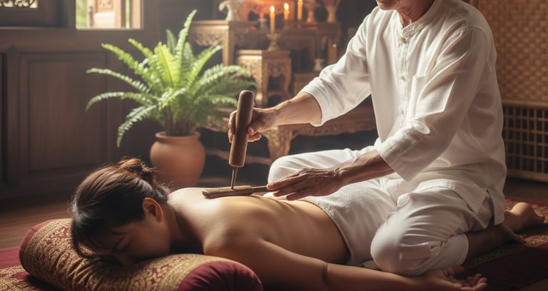 What it Feels Like: It looks scary, but it feels incredible. It is not painful. The magic of Tok Sen is vibration. When you press a muscle with a thumb, the pressure goes only as deep as the thumb. But when you tap wood against wood, a mechanical vibration travels deep into the muscle, down to the tendons and even the bone. It vibrates the tension away. The rhythmic "click-clack" sound is also surprisingly hypnotic and meditative.