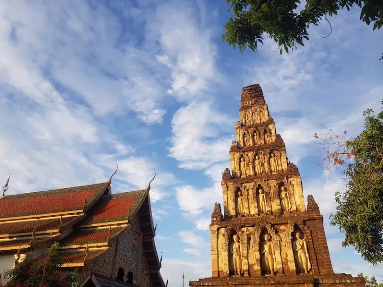The Architecture The main chedi here is not the bell shape you see in Chiang Mai. It is a square, stepped pyramid, reminiscent of styles found in India or Polonnaruwa in Sri Lanka. Each of the five levels has niches housing standing Buddha statues—60 in total.