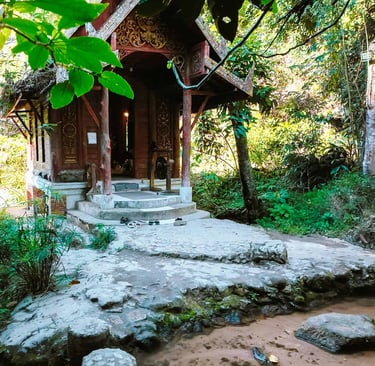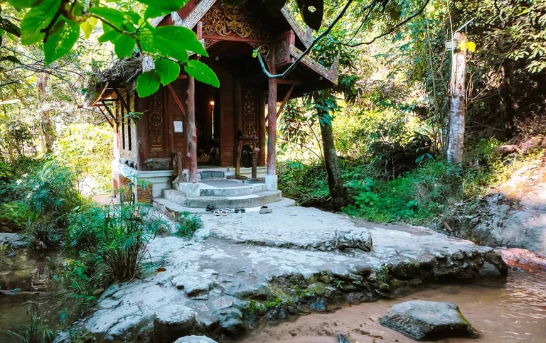 The Architecture: The Ubosot (ordination hall) sits right in the middle of the flowing stream. It is made of teak wood and covered in green moss due to the humidity. The roof is carved with intricate Lanna designs but weathered by the elements.