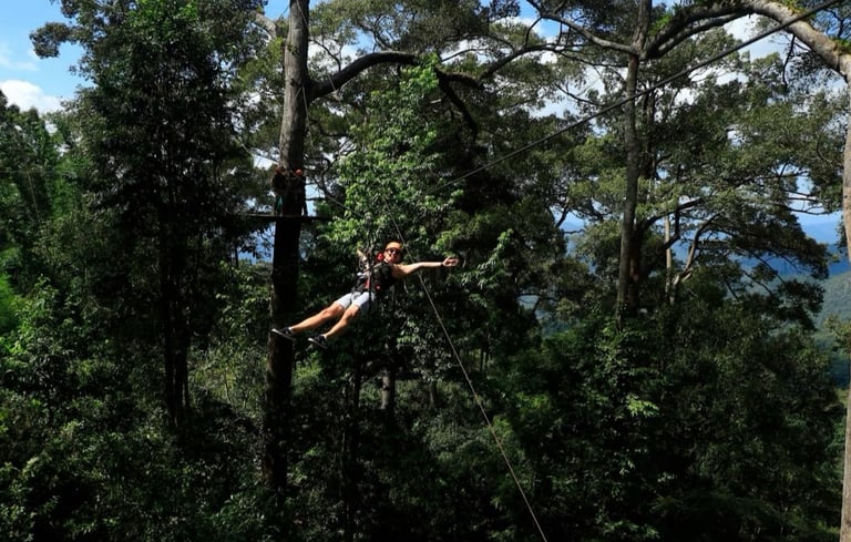 Imagine standing on a wooden platform suspended fifty meters above the ground. The air is cool and smells of damp earth and wild orchids. Below you, a sea of ancient green canopy stretches endlessly, hiding waterfalls, winding streams, and the secrets of the jungle. Above you, a steel cable disappears into the mist.